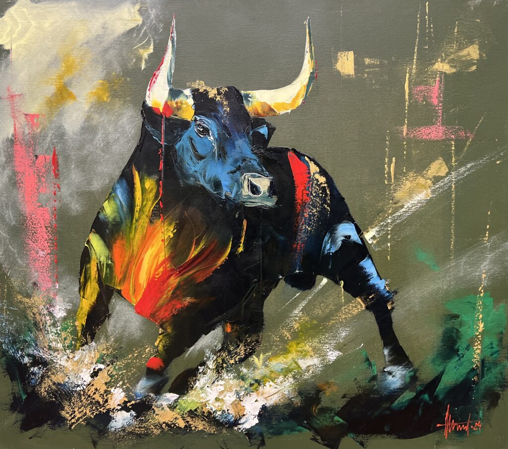 The abstracted backdrop, a tapestry of muted greens and soft yellows, serves as a striking counterpoint to the bull's explosive presence, grounding yet highlighting its vibrant hues. A brilliant use of contrast and texture brings depth and dimension, allowing the viewerβs eye to wander through the chaos and resolve in the determined gaze of the animal.