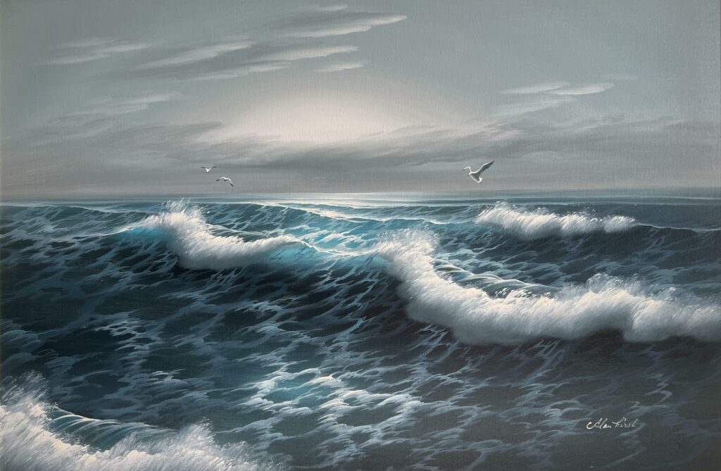 A masterful seascape unfolds before the viewer's gaze, where the turbulent dance of waves is captured with such vitality that one can almost feel the salty spray. The artist skillfully employs a palette dominated by cool blues and frothy whites, evoking the serene yet unpredictable nature of the sea. As if borrowed from Dutch maritime paintings, the interplay of light and shadow dances across the canvas, giving the piece a striking three-dimensional quality. The sky, a gradient of grey and silver, whispers of an overcast day, lending the scene a subdued, contemplative mood. Gulls soar effortlessly above, punctuating the vast expanse and adding a touch of life to this compelling ode to nature’s raw beauty.