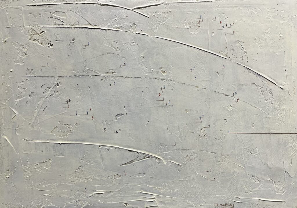 In this captivating tableau, we are invited to indulge in an exquisite dance of minimalism and whimsy. The canvas, dominated by an ethereal palette of whites and soft greys, evokes an endless snowy expanse, punctuated by diminutive figures that gracefully traverse the scene. These tiny, delicate strokes of color — hints of red and blue — suggest a lively ski slope, weaving a tale of motion and isolation.