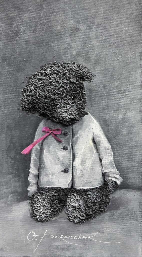The artwork presents a quietly whimsical teddy bear, draped in a charmingly oversized white coat, adorned with the playful pop of a pink ribbon. The artist employs a subdued grayscale palette, artfully intertwining textures that evoke a tactile, almost tactile quality. The bear's undefined features leave room for imagination, inviting viewers to project their own emotions onto this enigmatic figure. Reminiscent of a post-impressionistic exploration, the soft brushwork and muted background create a sense of depth and nostalgia, echoing a distant memory. This piece is both a tender tribute to childhood innocence and a sophisticated statement on the complexities of identity and presence. An elegant rendezvous between simplicity and sentiment.