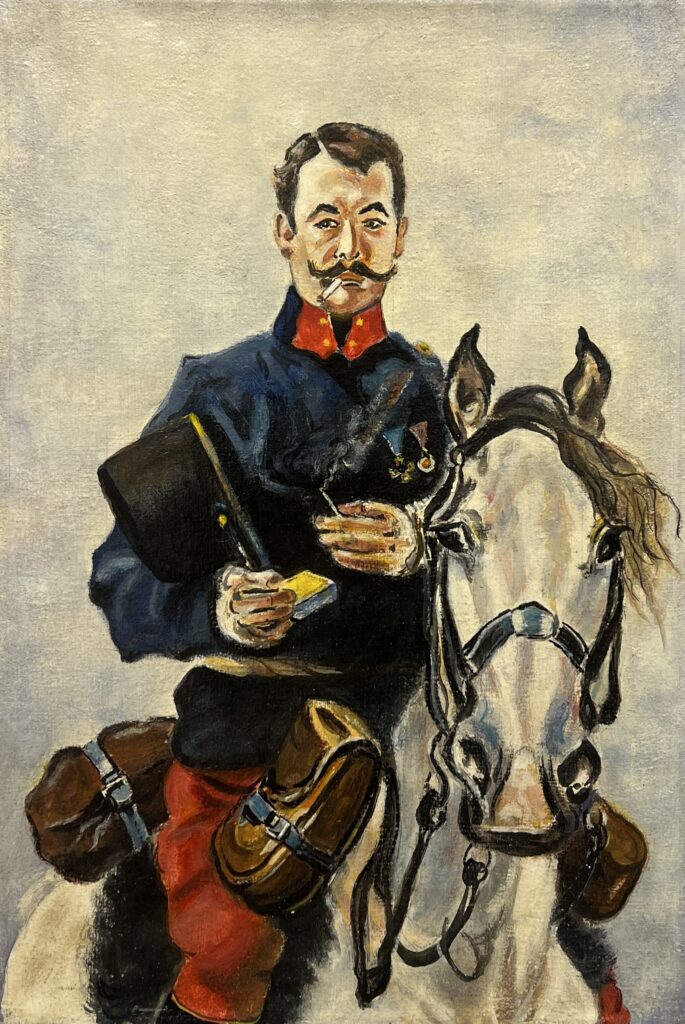 A proud cavalry officer, clad in a crisply tailored blue tunic and scarlet breeches, sits astride his noble mount with effortless poise. His neatly waxed mustache and polished medals catch the light as he holds a smoking pipe and a note of dispatch symbols of duty and refinement. Rendered in confident brushstrokes against a neutral ground, the portrait captures both martial elegance and the timeless bond between rider and steed.