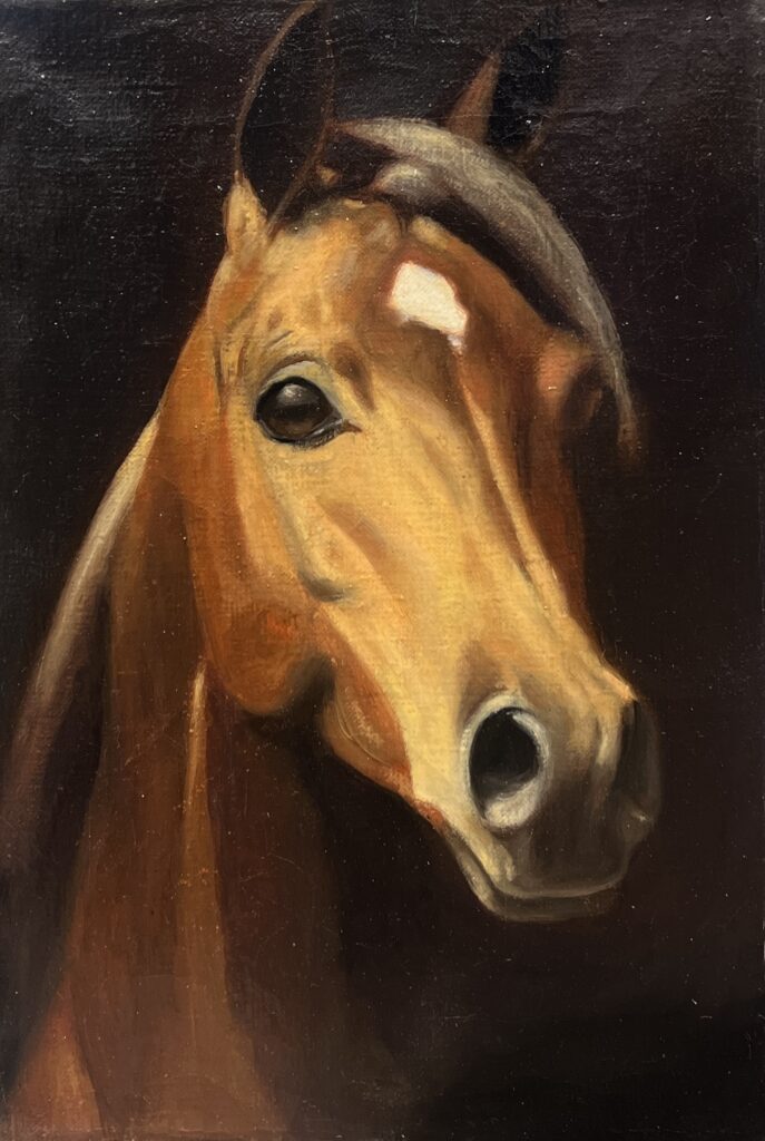 This captivating equine portrait embodies the spirit and nobility of its subject, encapsulated in a masterful interplay of light and shadow reminiscent of the chiaroscuro technique adored by Baroque masters. The painter's deft hand has woven together a warm, sumptuous palette, creating a golden aura that radiates from the horse's glossy coat. The composition draws the viewer into an intimate contemplation of the soulful gaze, as if the creature knows secrets of a world beyond our mundane reach. There's a palpable tension in the pose, a dynamic elegance that recalls the vivid immediacy of Romanticism, yet delivered with a delicate grace. The piece invites an exploration of the emotional dialogue between subject and observer, leaving an indelible impression of majestic tranquility.
