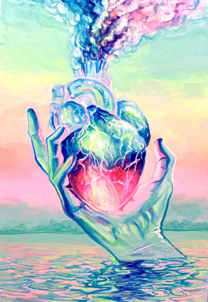 In a mesmerizing blend of surrealism and modern expressionism, this piece captures the viewer with a vivid tableau of color and form. A hand, emerging majestically from a fluid, iridescent surface, tenderly cradles a heart that seems to pulse with life. The heart, crowned with smoky tendrils in a symphony of pastel hues, echoes both passion and vulnerability. The artist skillfully employs a palette of aquamarine, gentle pinks, and fiery reds, crafting an ethereal ambiance that transcends reality. This visual feast challenges the dichotomy of heart and hand, evoking a dance of creation and fragility, as if to whisper a whimsical secret of the cosmos.
