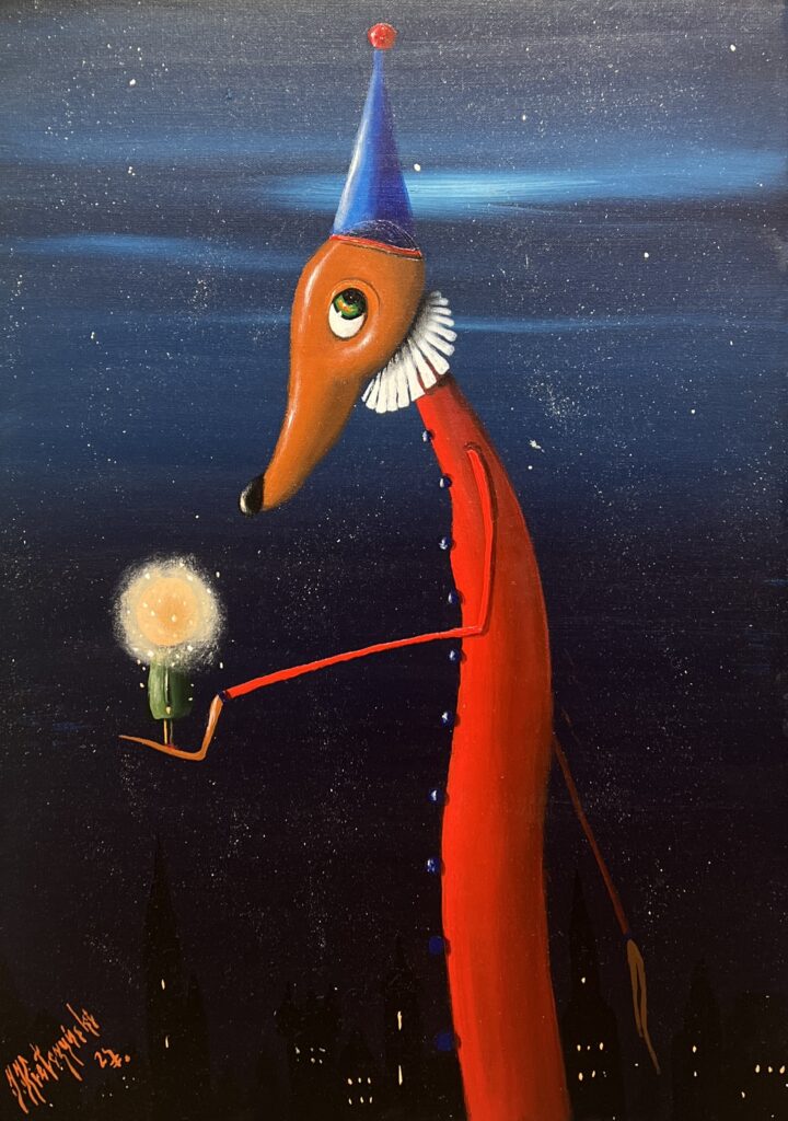 An enigmatic figure graces this canvas, blending elements of surrealism with whimsical charm. The elongated creature, adorned with a playful cone-shaped hat and a ruffled collar, is painted in vibrant hues of red and blue, evoking the joyous spirit of a carnival performer. Its long, slender form contrasts starkly against a deep, starlit night sky, suggesting an air of mystery and introspection.