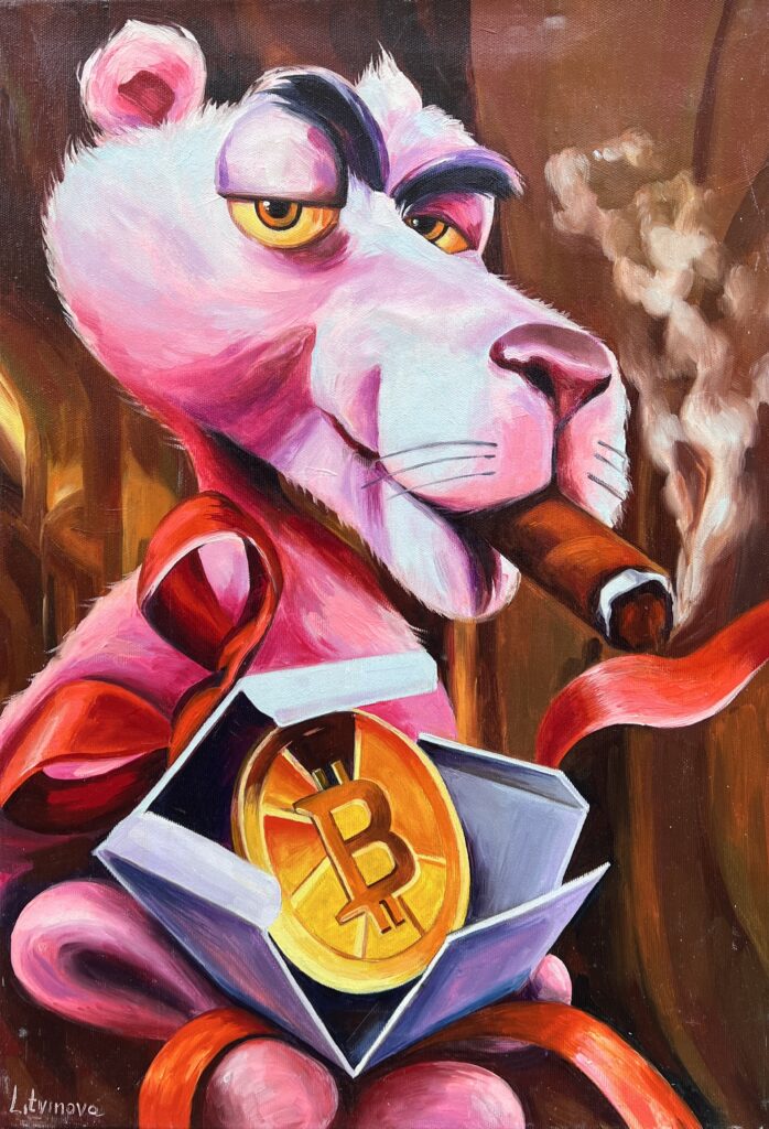 In this audaciously whimsical piece, the juxtaposition of classical cartoon charm with modern digital intrigue unfolds in harmonic chaos. A suavely amused pink cat, bearing a facial expression that exudes both mischief and wisdom, domineers the scene. It effortlessly puffs on a robust cigar, its smoky tendrils coalescing with the warm, earthen background. The deviant twinkle in its eye meets a virtual golden Bitcoin, provocatively nestled in an elegant box, draped with a luxuriant red ribbon. The composition bursts with a palette of vibrant pinks and rich ochres, capturing a playful critique on contemporary values. Evoking the spirit of pop art, this canvas dashes through traditional boundaries, weaving classic animation aesthetics with the provocative allure of modern currency.