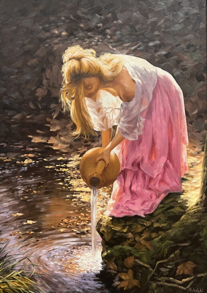 In this captivating tableau, we witness a mesmerizing dance between light and shadow, masterfully rendered in the impressionistic style. The young woman, draped in flowing pink and white fabrics, ceremoniously pours water from a rustic jug into the tranquil stream below. Her golden hair, a cascade of sunlight, offers a striking contrast to the lush, earthy tones of the surrounding environment. The artistβs brushwork is both delicate and deliberate, capturing the luminescent reflections that shimmer on the waterβs surface. This painting evokes a serene, almost nostalgic moment, reminiscent of 19th-century pastoral scenes, inviting the viewer to pause and reflect on the fleeting beauty of simplicity.