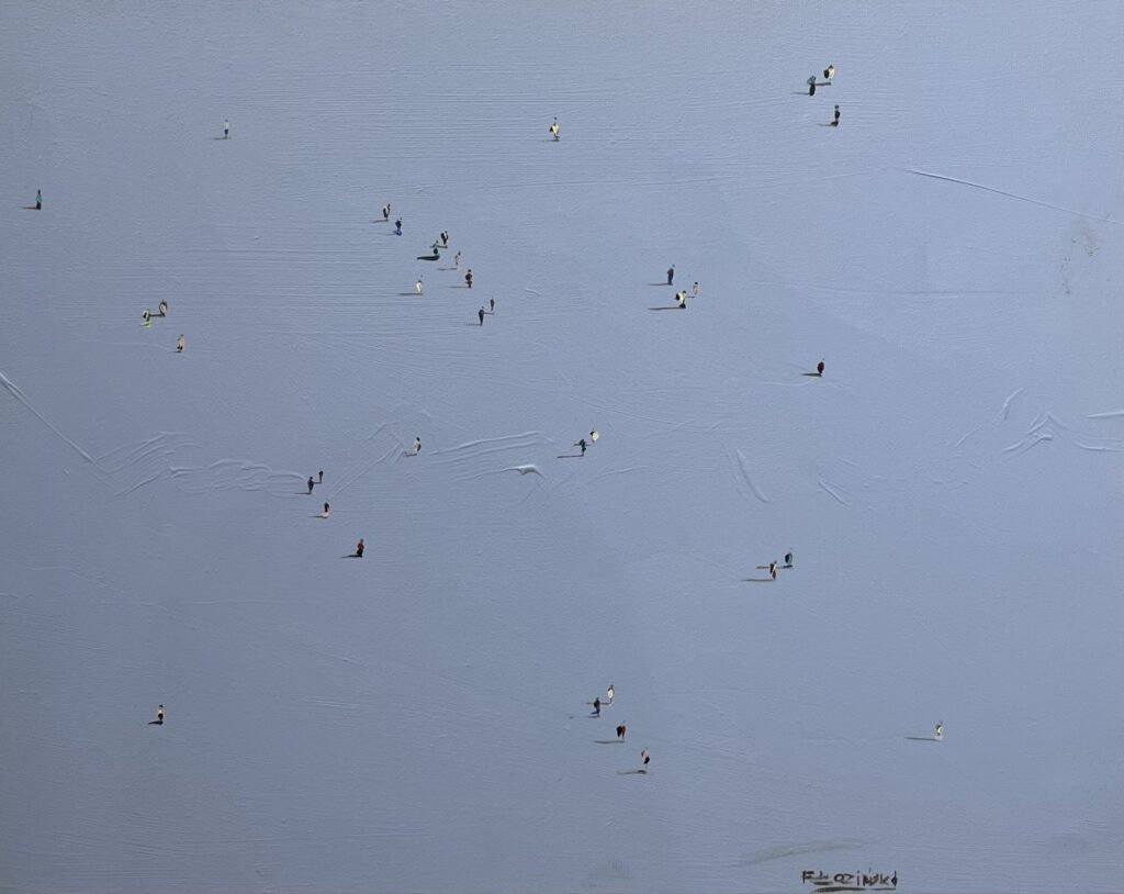 Here, we find echoes of minimalist abstraction, where simplicity unveils complexity. The sparse arrangement of figures suggests a narrative of connection and isolation, a delicate balance of solitude and community. Each figure, though small and distinct, contributes to the quiet symphony of life, creating a subtle yet profound commentary on the human condition.