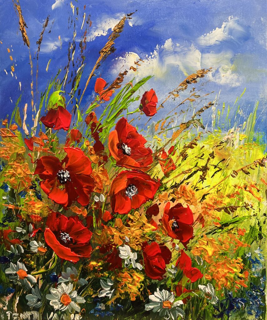In this captivating canvas, a riot of scarlet poppies and delicate daisies dance under a benevolent azure sky, their vibrant hues singing the song of summer with exuberant delight. The artist skillfully employs the impasto technique, layering rich textures that invite both touch and gaze. Bold strokes of crimson and gold intermingle with softer whispers of green, capturing nature's vivacious energy with an impressionist flair.