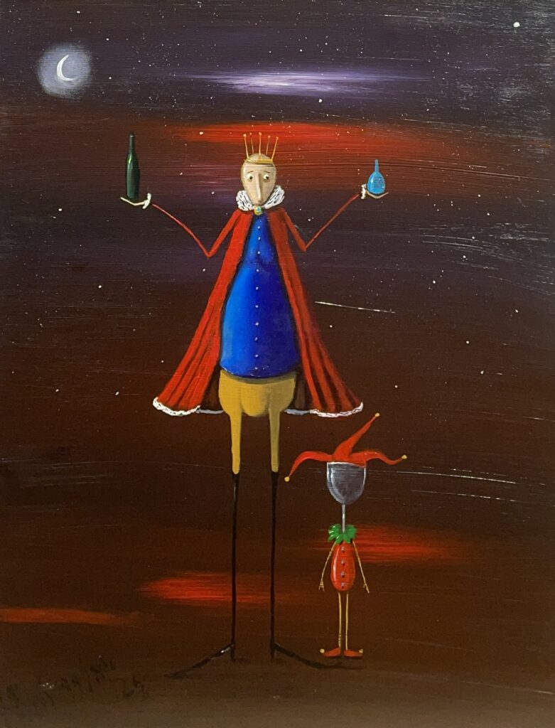 In this whimsical tableau, we are introduced to a surreal royal figure, poised as if in a delicate dance between the mysterious realms of dream and reality. The regal character stands tall, balancing bottles with elongated limbs that defy conventional proportions. Cloaked in vibrant blues and reds, it evokes a sense of childhood playfulness married with courtly elegance.