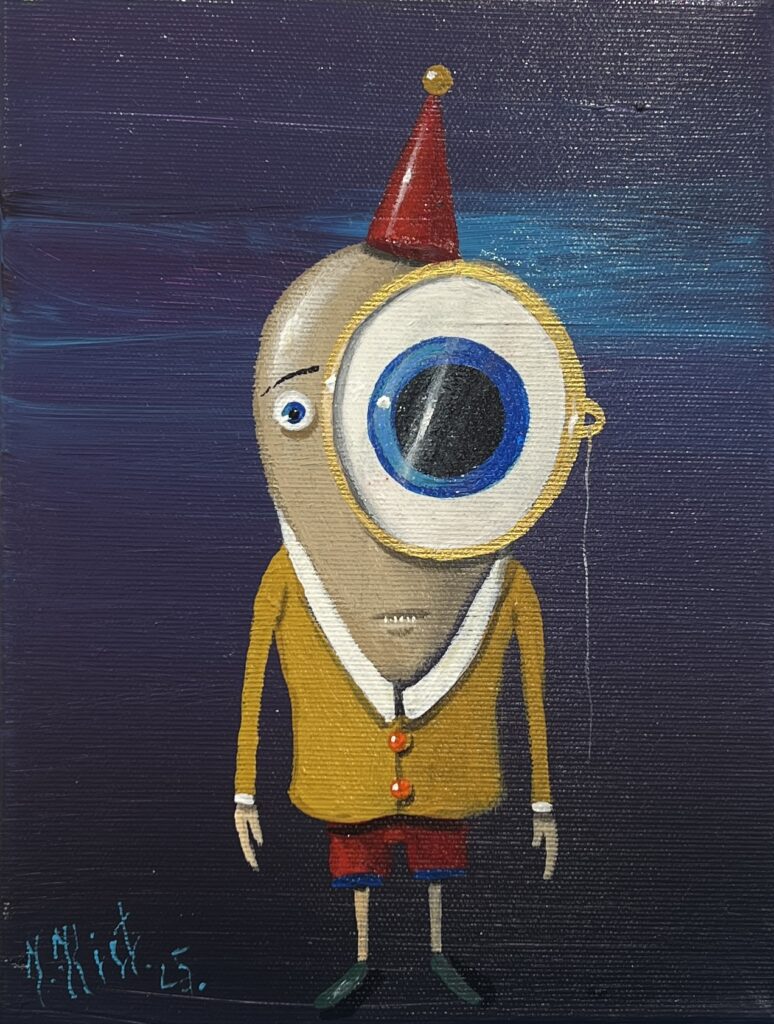 In a delightful display of whimsy and surrealism, this enchanting painting captivates the viewer with its singularly curious protagonist—a character straight out of a dreamscape, donning a red cone hat that hints at a playful mischief. The oversized monocular eye, framed in gold, becomes the focal point, challenging the observer to ponder the secrets it guards. Against a deep, enigmatic indigo backdrop, the figure's mustard tunic and crimson shorts inject vibrant contrast, and together with its wiry limbs, evoke a puppet-like charm.