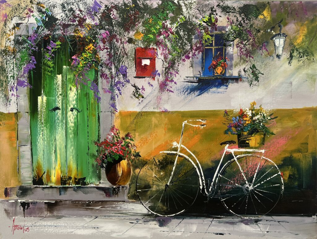 In this evocative tableau, a luscious interplay of colors and textures dances across the canvas, where a verdant door ushers us into an unseen world. Lustrous greens spill over into a riot of purple blossoms, cascading with wild abandon, reminiscent of impressionistic landscapes. The artist deftly captures the soulful silence of a sunlit afternoon, punctuated by an inviting bicycle and vibrant floral arrangements that nod to post-impressionist exuberance. The composition's chromatic symphony is accentuated by the soft glow of golden hues mingling with shadowy recesses, creating a rich tapestry of contrasts. Indeed, this work whispers of hidden stories, inviting the observer into its enchanting embrace.
