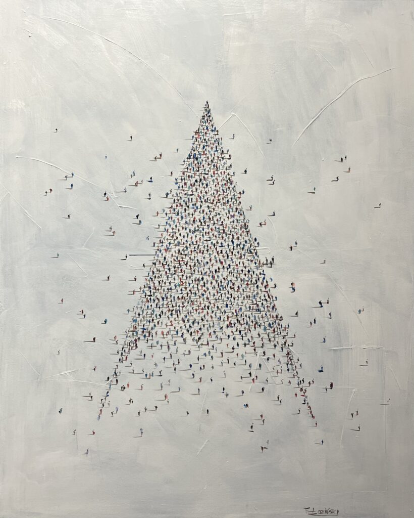A mesmerizing tapestry of human existence unfolds in this extraordinary tableau, where a multitude of figures converge to form a graceful, triangular procession. The composition, both minimalistic and intricate, alludes to the elegance of pointillism, each dot a living participant in a grand orchestration. The muted, near-monochromatic backdrop accentuates the vibrant, sporadic bursts of color, whispering secrets of individuality amidst an ocean of humanity. There's a whimsical order in the chaos, an allusion to the delicate balance of unity and solitude. This piece, with its subtle social commentary, captures the zeitgeist of collective aspiration and individual journey, resonating deeply with the viewer’s own unspoken narratives.