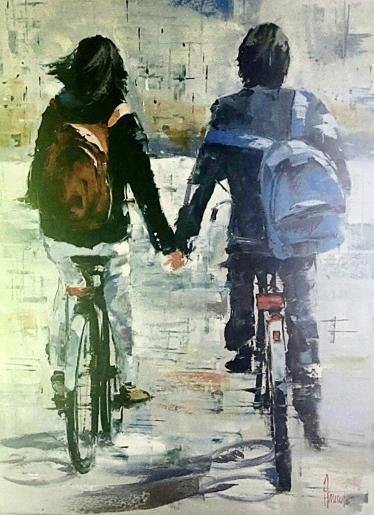 In this evocative tableau, we are invited into a whispering dance of color and form, capturing a fleeting moment of intimacy. Two figures, rendered with the gentle brushwork of an abstract impressionist hand, pedal their way into a sunlit horizon, hand in hand. The composition breathes with an air of spontaneity, where fluid strokes of blues and earthy tones create a dynamic contrast with their shadowy silhouettes. The subtle blurring of the background evokes the sense of motion and the ephemeral nature of time, suggesting a whimsical nod to modern romanticism. This work delicately balances both movement and stillness, leaving us charmed by its quiet simplicity and poetic resonance.