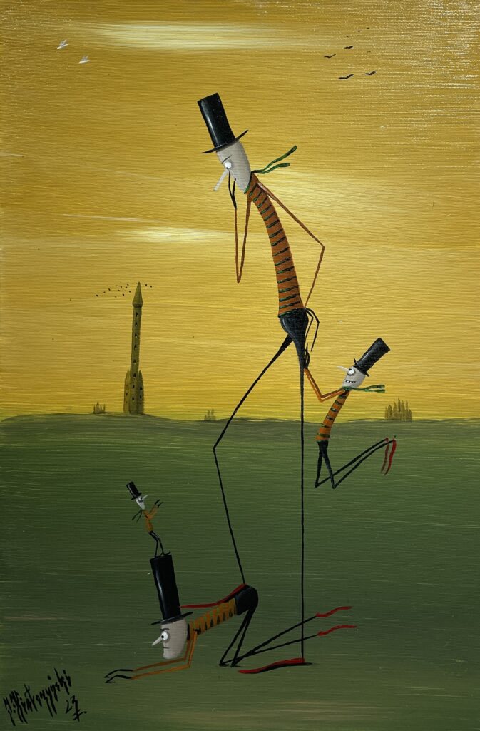 This stunning painting by Jarosław Kiełczyński, titled "TRUE GENTLEMEN", is a captivating piece of modern art. The painting is made with acrylic on canvas and features a vibrant combination of green and orange colors. This color combination is a perfect representation of the modern art style, and it will bring a unique and eye-catching touch to any home or office. The painting depicts a gentleman wearing a hat, surrounded by a group of men, and it measures 60x40cm.