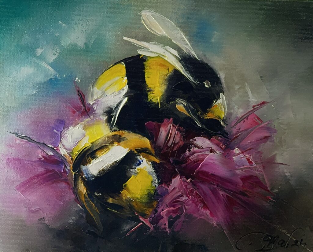 In this vibrant and dynamic composition, bold strokes of yellow and black capture the joyful essence of bees amidst a symphony of pinks and purples. The artist employs a masterful blend of impressionistic flair and abstract expressionism, allowing the viewer to feel the buzzing vitality of these industrious creatures. The play of light and shadow dances across the canvas, imbuing the scene with a lively contrast that elevates the bees from mere pollinators to subjects of reverent beauty. The rich, textured background adds depth, inviting one to get lost in its swirling hues, while the focused foreground ensures the bees' energy remains the undisputed centerpiece. It's a delightful, spirited ode to nature's artistry.
