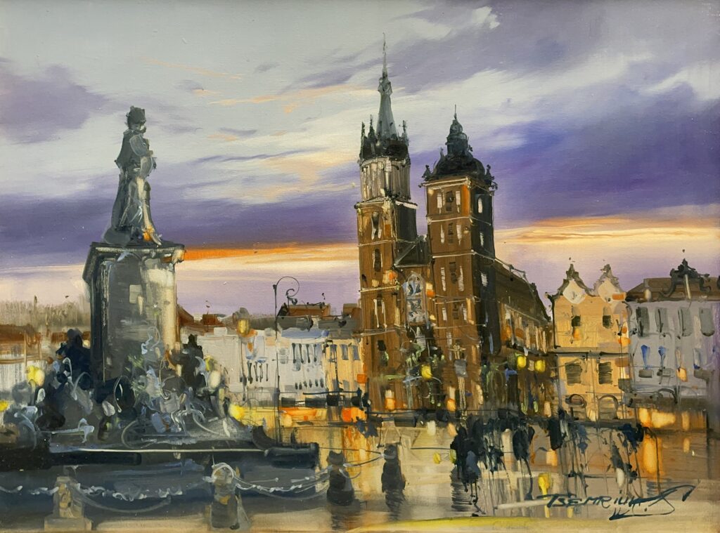 In this captivating canvas, the majestic skyline of a historical city unfurls at twilight, balancing delicately on the cusp of day and night. The painter deftly captures the duality of serenity and grandeur in a scene reminiscent of the Impressionist era, where soft brushstrokes dance with a tender luminosity. The towering brick structures, rendered with precision, evoke a dignified sense of permanence, while the twilight sky above shimmers in an ethereal symphony of violets and gold.