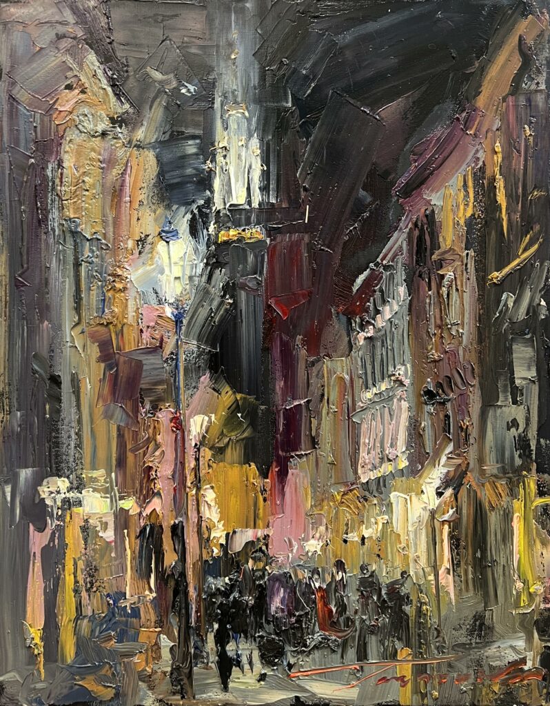 In this captivating urban tableau, the artist channels the fervor of a bustling evening street with impassioned strokes and a palette pulsating with nocturnal vitality. The composition, a jubilant dance of light and shadow, draws inspiration from the Impressionists, yet boldly dares to traverse its path with a contemporary vigor. Thick impastos of deep indigo and muted ochre weave together, crafting a narrative of silhouettes that seem to waltz through the gleaming twilight. The deliberate, textured layers evoke a sense of depth, inviting the viewer to wander amidst the depicted maze of glowing facades. It is here, in the rich tapestry of tones and textures, where the magic residesβa harmonious symphony of visual delight and abstraction.