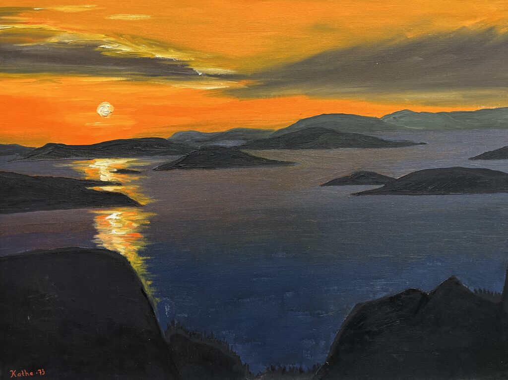 Awash in the enchanting hues of twilight, this evocative seascape marries the quiet majesty of nature with the artist's keen eye for contrast and light. The dusky silhouette of the hills frames a symphony of deep blues and fiery oranges, echoing the works of the great post-impressionists. The sun lingers like a grand, celestial conductor, orchestrating a radiant cascade upon the water's surface—a sublime interplay of reflection and reality. The artist deftly contrasts serene stillness with vibrant dynamism, inviting the viewer to linger in the tranquil embrace of dusk. This painting is not merely a depiction, but an invitation to wander into a world where light dances and shadows whisper. A masterful ode to the fleeting beauty of the day's end.