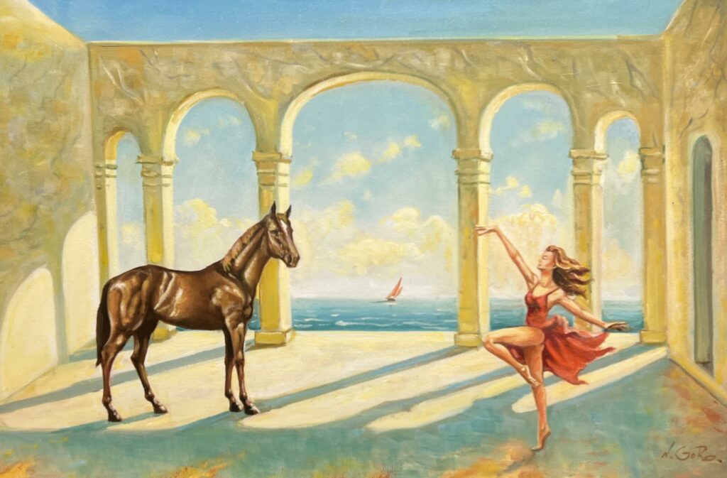 In this exquisite tableau, a graceful dancer pirouettes in perfect harmony with a poised horse under the serenely blue sky that curves above an arcaded terrace. The scene, with its ethereal light, blurs the lines between the tangible and the dreamlike, evoking surrealist sensibilities. The composition is a dance of contrastsβearthy browns and resplendent terracotta twirls juxtaposed against cool azure seas and pale, sunlit columns.
