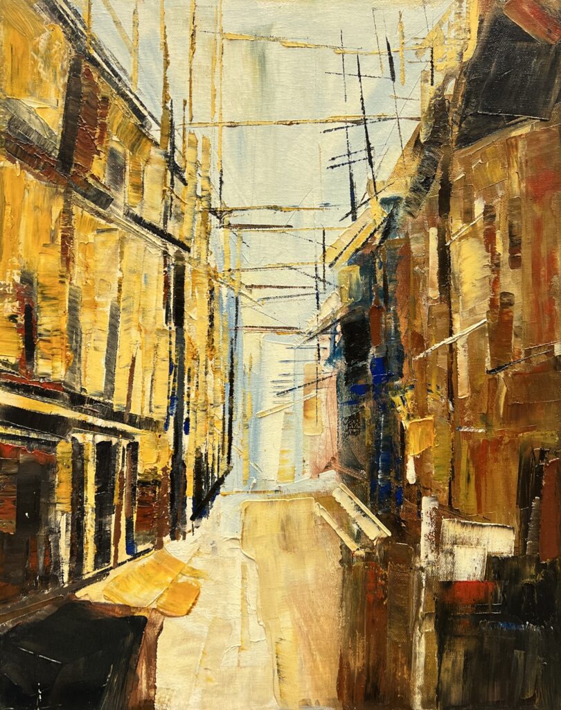 This striking cityscape presents an interplay of abstraction and structural composition, where architecture dissolves into a rhythmic symphony of lines, color fields, and dynamic brushstrokes. The artist constructs an urban environment that is both familiar and fragmented an ephemeral, almost dreamlike vision of the contemporary metropolis.