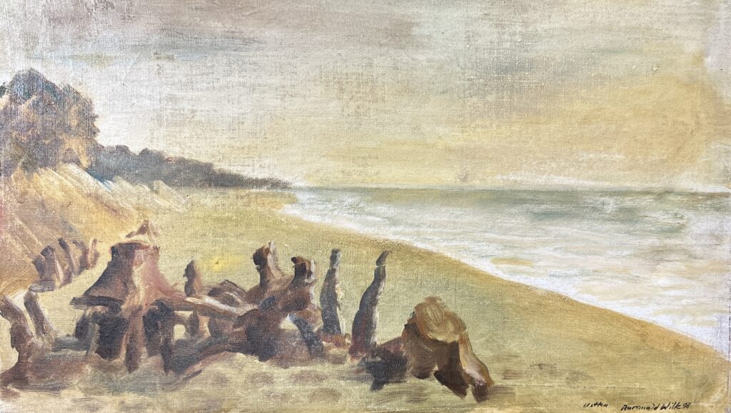 The painting shows a seaside landscape with a view of the beach and the sea, painted in a delicate, subdued color palette. In the center of the composition are tree trunks and roots torn from the ground, which give the scene a dramatic, almost surreal character. On the left you can see a rugged bank covered with vegetation, suggesting natural erosion and variability of the landscape.