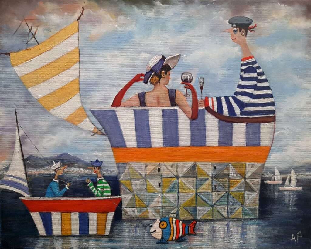 Hundreds of paintings and sculptures are in collections all over the world, including USA, New Zealand and even Afghanistan also in all European countries. Currently inspired by ceramic art in a funny way trying to tell about human passions. Behind the fairy-tale decorations are hidden the deepest human passions and desires. Canvas stretched on wooden frame. Colors of the painting may slightly differ from photos due to screen settings.