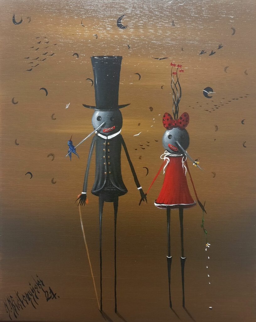 His art is inspired by Bosch and Holland art masters. He designed theater set for “Life is Beautiful”.