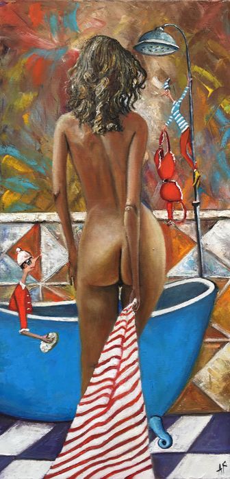Hundreds of paintings and sculptures are in collections all over the world, including USA, New Zealand and even Afghanistan also in all European countries. Currently inspired by ceramic art in a funny way trying to tell about human passions. Behind the fairy-tale decorations are hidden the deepest human passions and desires. Canvas stretched on wooden frame. Colors of the painting may slightly differ from photos due to screen settings.