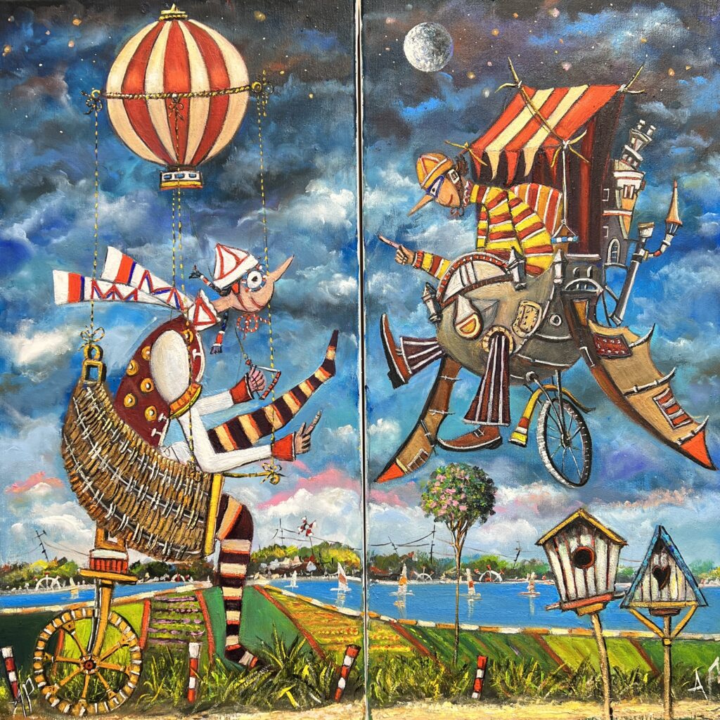 In this captivating visual tapestry, playful surrealism dances with vivid whimsy, conjuring a dreamscape where gravity seems but a suggestion. The artwork presents a fantastical tableau of striped figures atop fantastical vehicles, seemingly plucked from the minds of Chagall and the imaginations of steampunk dreamers. The palette is a jubilant symphony of reds, blues, and ochres, evoking a carnival in suspended animation under a luminous moon.