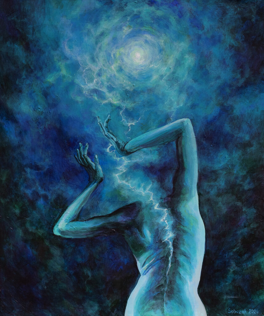 In this mesmerizing canvas, the artist invites us into an ethereal dance between corporeal form and celestial light. An azure tapestry unfolds, where deep blues and vibrant greens swirl into an almost cosmic embrace. A singular figure reaches skyward, fingers seemingly caressing the strands of energy that descend from the celestial sphere above. The composition is evocative of an electric existentialism, reminiscent of the Expressionist's emotional depth yet tempered with a touch of Surrealism's dreamlike whimsy. Light and shadow perform a delicate pas de deux, rendering an illusion of depth that draws the viewer into its hypnotic grip. Thus, the piece transcends mere imagery, becoming an exploration of humanity's perpetual quest for the divine.
