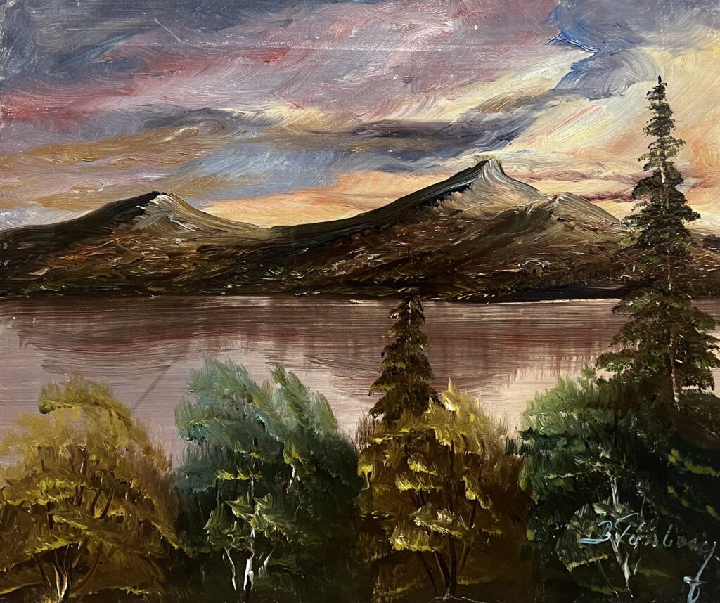 A captivating ode to the serene majesty of nature, this evocative landscape painting draws us into its harmonious wilderness. With masterful brushwork reminiscent of the Impressionist movement, the artist plays with the ever-changing light, capturing the ethereal glow of sunset reflecting upon tranquil waters. The mountains stand tall, their peaks kissed by soft, pastel skies that swirl in orchestrated chaos. Each stroke conveys a sense of movement, inviting viewers to lose themselves in the depths of its layered composition. The palette is an enchanting symphony of earth tones accented with vibrant greens and twilight pinks. This piece is not merely a portrayal of nature—it whispers the timeless dialogue between earth and sky, leaving an indelible mark on the soul.