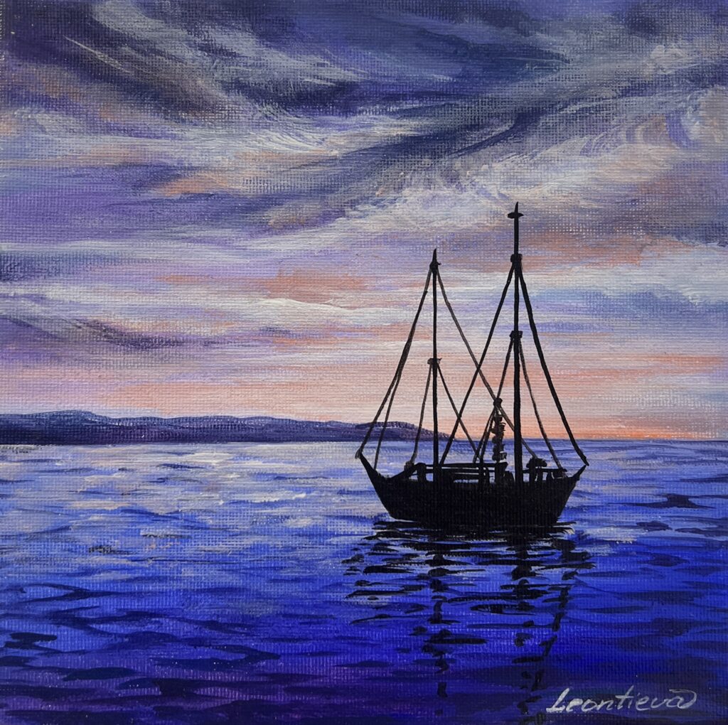 In this evocative tableau, the artist captures the serene mystique of twilight on the open sea, where the delicate interplay of light and shadow dances across the canvas. The silhouetted ship, elegantly poised against an indigo sea, is a testament to the artist's impeccable sense of balance and composition. With a color palette that transitions seamlessly from the softest lavenders to deep, velvety blues, the sky above descends in swirls reminiscent of a Turner-esque dreamscape, whispering secrets of distant horizons. This work, transcending mere maritime depiction, invites the beholder to embark on a voyage of introspection, buoyed by the soft yet commanding rhythm of the waves beneath. Here, the boundaries between sea and sky blur, leaving us adrift in a world where reality meets reverie.