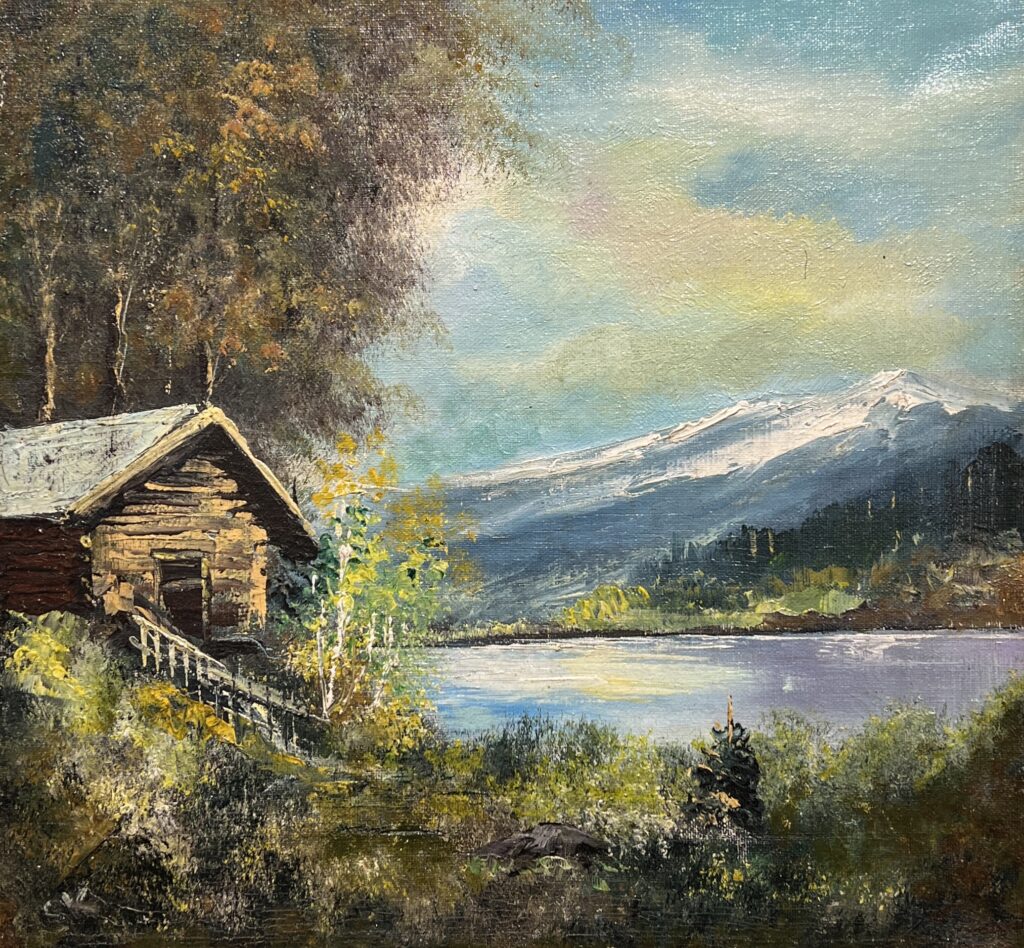 In this quaint yet captivating landscape, the artist transports us to a serene glade nestled amidst towering trees and tranquil waters. The rustic cabin perched delicately on the edge evokes a sense of solitude and harmony, inviting the viewer to ponder the peaceful simplicity of yesteryears. The palette is a rich tapestry of earthy browns and verdant greens, juxtaposed with the soft blues and purples of the distant skyline, where snow-capped peaks kiss the heavens.