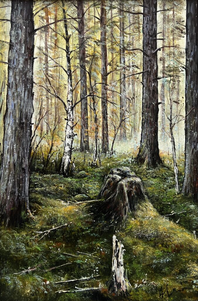 In this enchanting woodland tableau, the artist invites us into a serene forest, where sunlight filters through the towering trees, casting an ethereal glow upon the carpet of mossy undergrowth. The palette, rich with earthy browns and verdant greens, whispers of nature's quiet elegance, while the interplay of light and shadow creates a harmonious dance across the canvas.