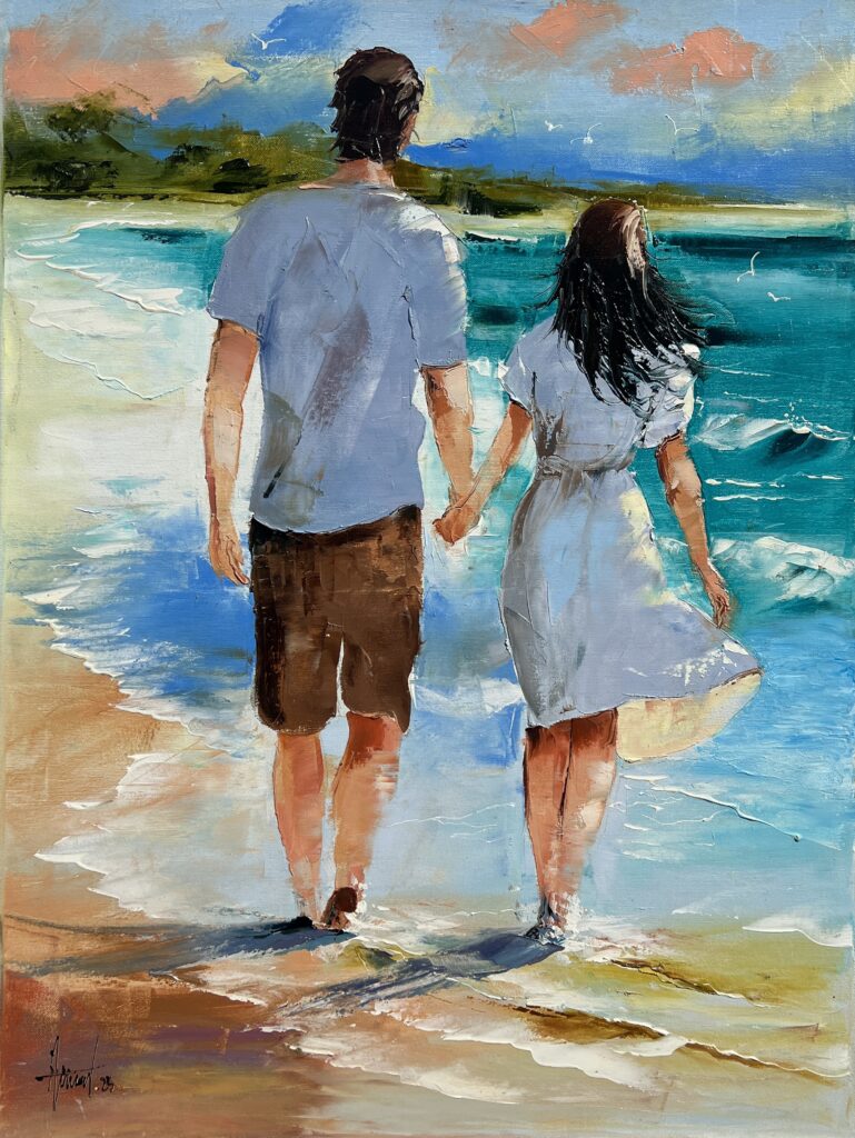 In an enchanting dance between color and emotion, this painting captures a tender moment of serene intimacy. The figures, strolling hand in hand, evoke a romance subtly reminiscent of impressionistic reverie. The artist masterfully uses a palette of gentle blues and vibrant ochres, crafting a seaside promenade where land kisses sea. The play of light accentuates the gentle sway of the waves, while the sky, brushed in pastel hues, whispers of a tranquil day. Rich texture and fluid brushwork add a dynamic depth, inviting the viewer to step alongside the couple, basking in the warmth of the sun-kissed shore. An ode to love's quiet moments, this work enchants as effortlessly as a summer breeze.