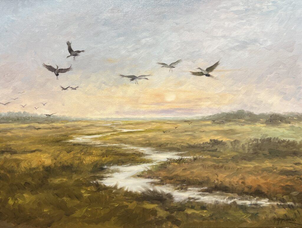 In this mesmerizing landscape, a timeless dance of light and nature unfolds before us, reminiscent of the poetic grace of the Barbizon school. The viewer is drawn into the expansive horizon where a soft, pastel sky meets the golden embrace of a tranquil wetland. A flock of birds, captured mid-flight, animates this serene tableau with a gentle vitality. Their silhouettes soar against a nuanced tapestry of blues and pinks, evoking both freedom and harmony. The undulating land, rendered with masterful brushstrokes, guides the eye effortlessly through its luxurious textures. This composition lingers in the mind, a homage to the subtle interplay between earth and sky, imbuing feelings of peace and reflection.