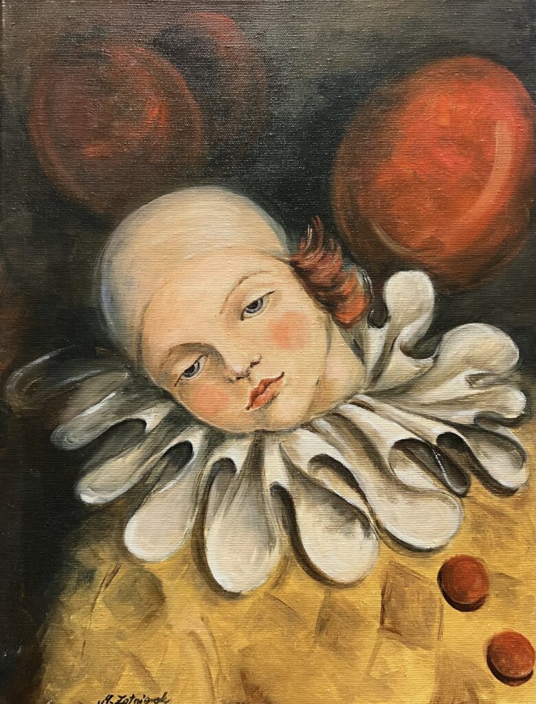 Introducing "Whimsical Clown with Balloons," a captivating painting by the talented artist M. Kotarba. This unique artwork features a charming clown adorned with a ruffled white collar, surrounded by vibrant red balloons. The background is a masterful blend of dark and warm tones, creating a dramatic contrast that highlights the central figure. The artist's skillful use of light and shadow adds depth and dimension, making the painting visually engaging and intriguing.
