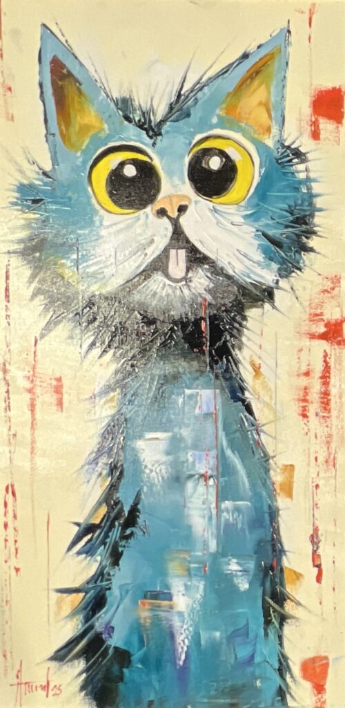 In this whimsical exploration of the feline form, we encounter a creature whose eyes, wide and luminous, captivate with an intensity that borders on the comical. The artist's brush dances across the canvas in a cacophony of blues and warm yellows, creating an almost hypnotic contrast against the muted background, punctuated by bold strokes of red. This expressive portrayal, reminiscent of a modern fauvist approach, fuses playful absurdity with keen observation.