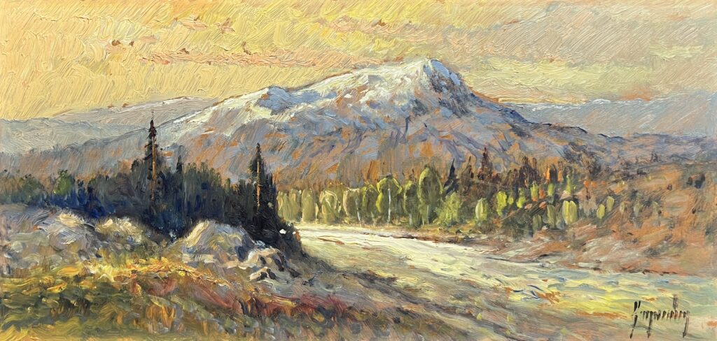 In this captivating landscape, the artist masterfully captures the serene majesty of a snow-capped peak bathed in the warm, amber glow of an ethereal sunrise. Reminiscent of Impressionistic endeavors, the painter employs loose, expressive brushstrokes that dance across the canvas, inviting the viewer to immerse in its tranquil yet dynamic atmosphere. The color palette is a harmonious blend of pastel yellows, vibrant greens, and subtle blues, creating a symphony of contrasts between the rugged mountain and the soft, luminous sky. The delicate play of light suggests an emotional depth, evoking both the awe of untouched nature and the fleeting beauty of dawn. This exquisite work is an enchanting glimpse into the splendor of the natural world, captured with both technical skill and poetic sensitivity.