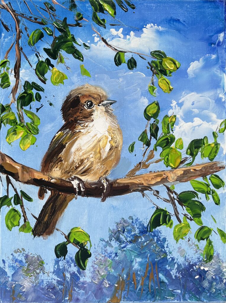 In this charming tableau, the artist masterfully captures the serenity of a lone bird perched gracefully amidst verdant foliage. The composition is imbued with a sense of tranquility, where the soft, sunlit feathers of the bird contrast exquisitely with the lively greens of the surrounding leaves. This juxtaposition whispers secrets of impressionistic influences, inviting whispers of Monet’s arboreal reveries.