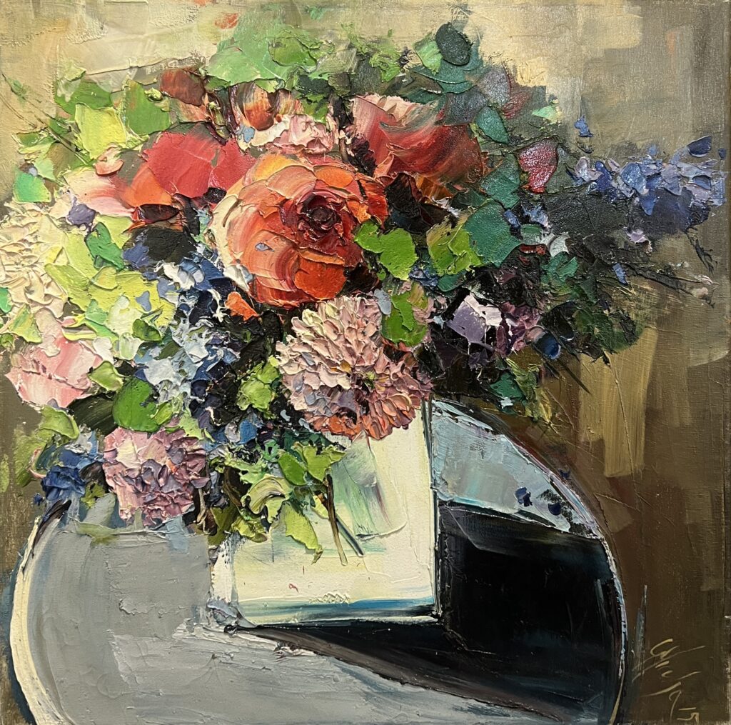 A riot of florals bursts forth, teetering between the realms of impressionism and expressionism. This bouquet, a vivid dance of textures, captivates with its palette of fiery reds, blush pinks, and verdant greens, harmoniously juxtaposed with cooler blue undertones. Thick, gestural brushstrokes render each petal and leaf with sculptural vitality, inviting the eye to luxuriate in the impasto’s depth. The composition is anchored by the subtly painted table and book, offering a serene counterpoint to the floral exuberance. Echoes of Van Gogh's emotional intensity and the ephemeral beauty beloved by the Impressionists are felt, yet the work retains a singular, modern vivacity that speaks to the artist's unique vision.