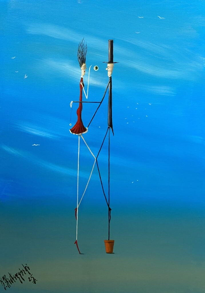 In this whimsical and surreal composition, one is immediately struck by the delicate elegance and playful imagination at play. The duo of elongated, ethereal figures stand in a dreamlike dialogue, suspended in a vast expanse of azure. Their impossibly slender forms and exaggerated features nod subtly to the surrealist tradition, evoking a sense of curiosity and wonder.