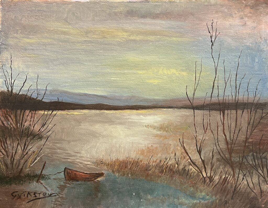 Ah, behold this enchanting landscape, where time seems to whisper gently through the hues of dawn. The artist has masterfully woven a tapestry of tranquility, marrying Impressionistic brushwork with a realist's eye for detail. A solitary boat, lovingly tucked into the serene embrace of the lake, invites the viewer to embark on a journey of quiet introspection. The ethereal sky blushes with soft pastels, casting a dreamy reflection upon the water's surface, while the skeletal branches frame the scene with delicate precision. Here, nature's gentle symphony plays a silent ode to solitude, as the canvas captures fleeting light in a moment painted forever. A masterpiece that resonates with the soul, evoking both nostalgia and promise.