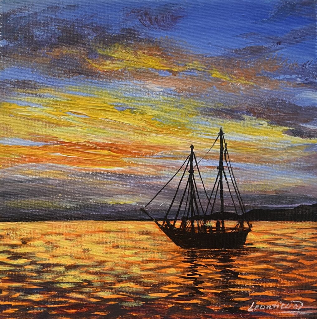 In a mesmerizing dance of color and nostalgia, this exquisite seascape captures a lone ship silhouetted against a blazing sunset. The artist skillfully intertwines Impressionistic flourishes with the serene beauty of nature, each brushstroke echoing the gentle caress of the evening breeze. The vibrant palette of azure, gold, and fiery orange evokes a sense of warmth and wonder, as if the sun itself were whispering tales of distant voyages. The contrasting dark silhouette of the ship creates a profound depth, drawing the viewer into a tranquil embrace. An enchanting homage to the eternal romance between sea and sky, this piece beckons with the promise of endless horizons.