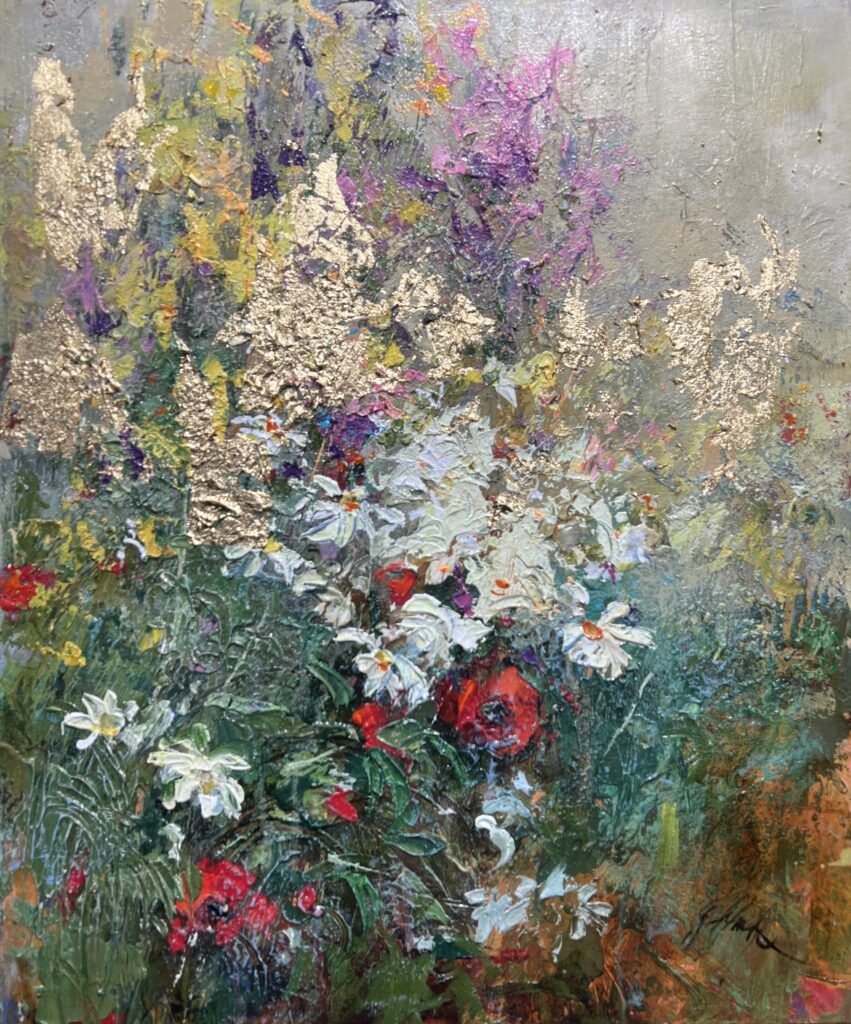 In this lush, almost ethereal garden tableau, the artist invites us to a visual feast that dances on the delicate boundary between reality and dreams. The canvas explodes with a symphony of colors—a riotous blend of verdant greens, vibrant reds, and soft whites—each brushstroke a note in an orchestrated crescendo. Flecks of golden accents shimmer like sunlight filtering through early morning mist, adding an opulent layer of texture and intrigue. The composition, reminiscent of impressionist tendencies, captures the fleeting essence of natural beauty with a joyful abandon that charms the observer. This piece is a vivid testament to nature's unrestrained elegance, seasoned with a whisper of enchantment and a wink of whimsy.