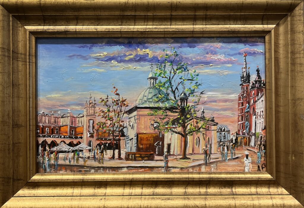 In this enchanting tableau, the artist breathes life into a bustling Old Town square. A symphony of pastel hues weaves through the sky, contrasting vividly with the earthy tones of the historic architecture. The use of impasto technique introduces a tactile wonder, inviting both the eye and the hand to explore its textured depths. Trees stand as silent sentinels, their verdant foliage a vibrant punctuation against the warm stone facades. Figures, rendered in suggestive brushstrokes, meander with the languid grace of a lazy afternoon. This piece, echoing the influences of post-impressionism, delicately balances emotion and form, capturing a moment of serene vitality with charmingly playful elegance.