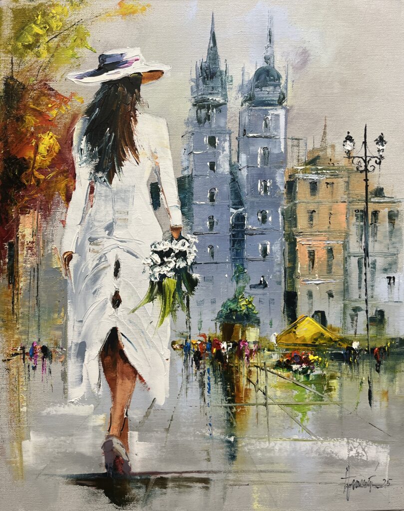 In this captivating canvas, the artist conjures a scene where elegance meets urban charm, softly echoing the impressionistic whispers of Monet. The figure of a woman, gracefully poised in a flowing white dress, strides purposefully through a rain-dappled plaza, her presence as commanding as the towering architecture that frames her path. Her hat, a cascade of mystery, reflects a subtle play of light capturing the fleeting beauty of a sun-drenched afternoon.