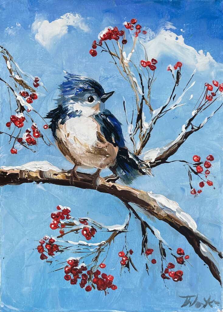 Behold a delightful avian symphony captured with an elegance that flutters between realism and impressionism. This exquisite piece enchants the viewer with a charming bird perched delicately on a snow-kissed branch, surrounded by vibrant red berries that pop against the serene azure sky. The artist employs a deft hand, utilizing fluid brushstrokes that suggest the gentle whisper of a winter breeze.