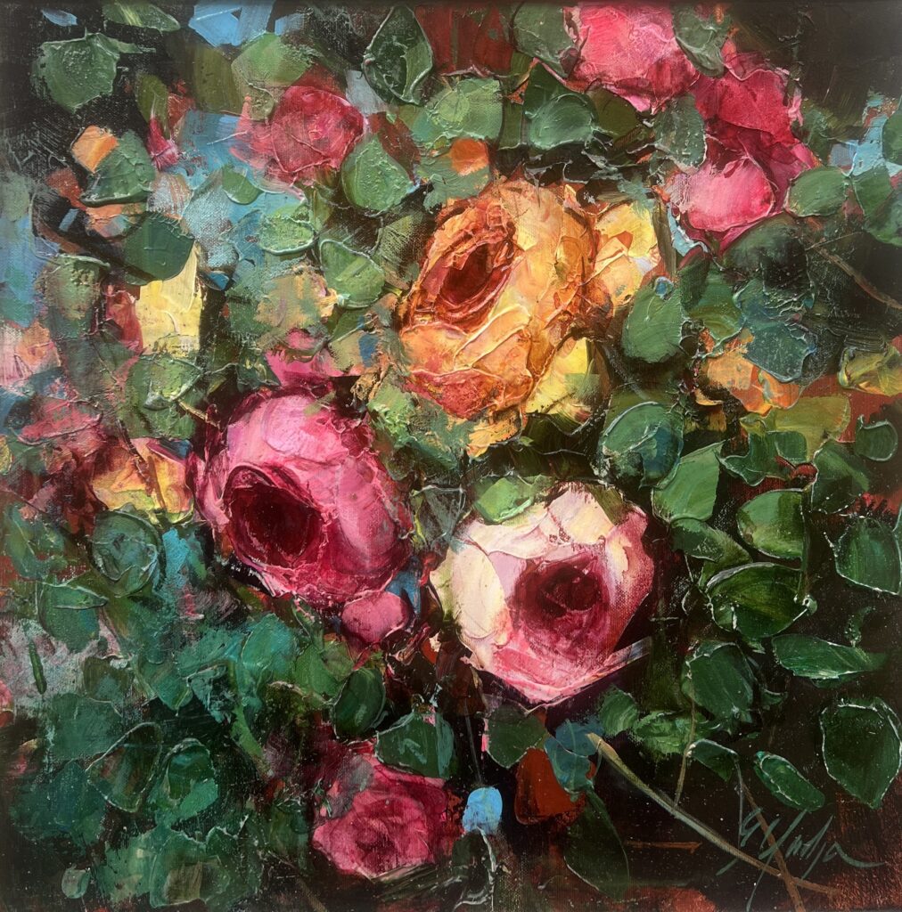 In this delightful bouquet, we find an exuberant dance of color and form, reminiscent of the unabashed vibrancy of the Impressionists yet tempered with a unique modern flair. The artist employs thick, luscious impasto strokes, creating a tactile surface where emerald leaves intertwine with roses of audacious pinks and sunny yellows. This work exudes a dynamic energy, as if the blooms are perpetually caught in a gentle breeze. The juxtaposition of the deep, shadowy background enhances the liveliness of the foreground, allowing the flowers to almost pirouette off the canvas. Each stroke whispers a playful secret, inviting the viewer into a garden of eternal springtime. This piece speaks not only to the vision but also to the soul, capturing a moment of joy rendered timeless.