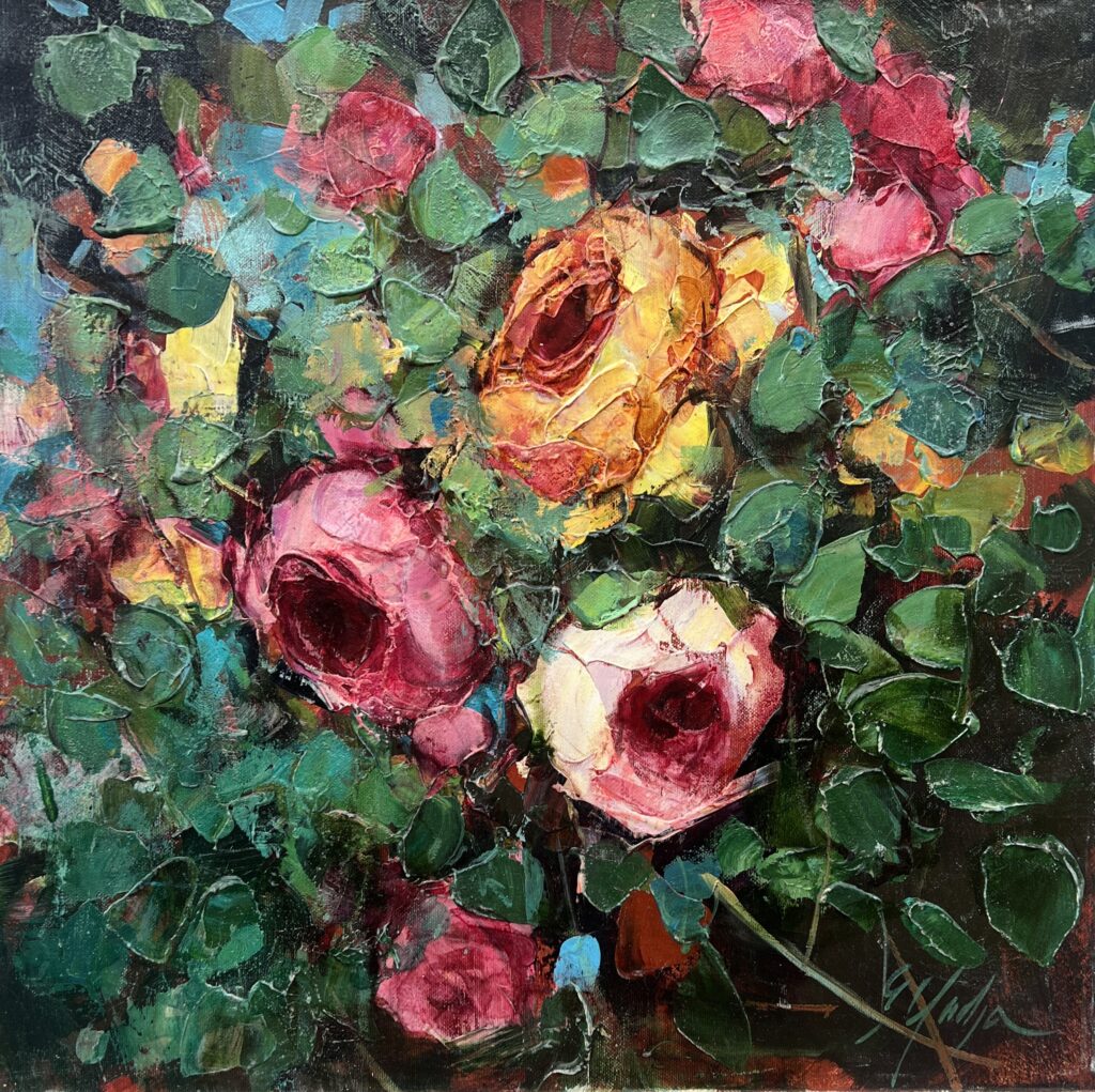 In this vibrant tableau, reminiscent of the fervent brushwork of the Impressionists, a garden riotously bursts into bloom, an ode to the ephemeral beauty of nature. The canvas is alive with an exuberant palette of passionate reds, lush greens, and sunlit yellows, each stroke a tangible whisper of texture and emotion. The roses, with their sumptuous petals, dance flirtatiously amidst the verdant foliage, capturing the very essence of a summer day, full of life and romance.